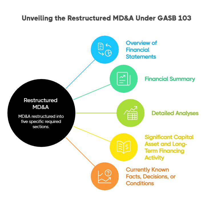 After GASB 103: That template is no longer compliant. Finance teams must restructure the MD&A to align with the new five-section framework, which means rethinking the narrative flow, the data inputs, and the linkage between financial and operational information.